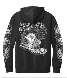 Printed on a very nice pull over black hoodie. It fits nice so ladies don’t be scared to get one ,super soft . Logo on front / Art on back / Art on sleeves !